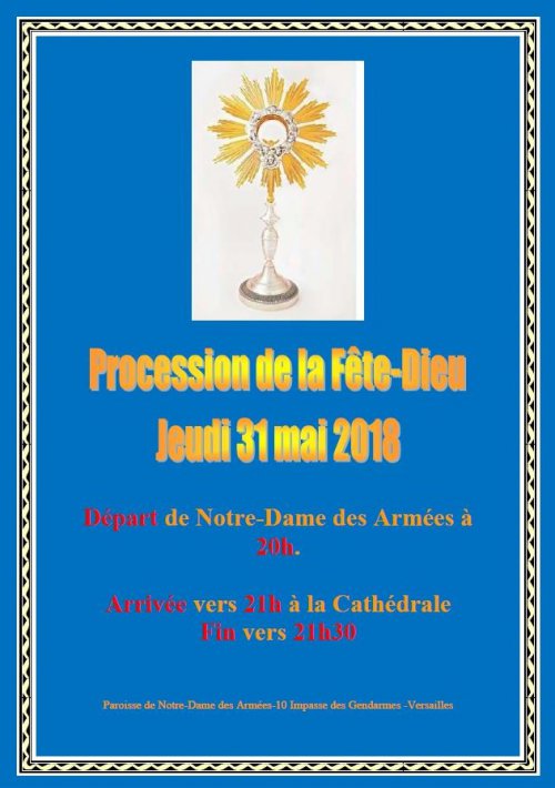 Ce jeudi 31 mai, en la solennité de la Fête Dieu, la Paroisse Notre-Dame des Armées, la Paroisse Saint-Louis (cathédrale) et la communauté de la Chapelle de l’Immaculée Conception proposent une procession de la Fête-Dieu au départ de Notre-Dame des Armées vers la Cathédrale Saint-Louis à 20h