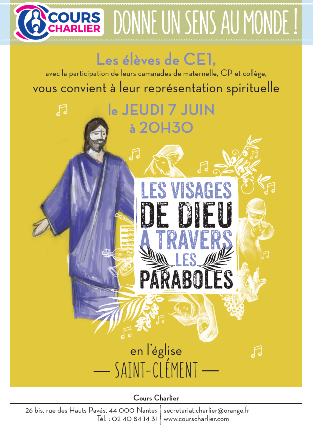 Accueil » Nos archives » Représentation de fin d’année du Cours Charlier (Nantes) Summorum Pontificum Représentation de fin d’année du Cours Charlier (Nantes) Le Cours Charlier vous invite à sa représentation des ‘Visages de Dieu à travers les paraboles’ Cours Charlier Article précédentBrève: La messe dans la forme extraordinaire au Trayas Article suivantLe Forum Catholique invite l'abbé Philippe Laguérie 4 juin 2018