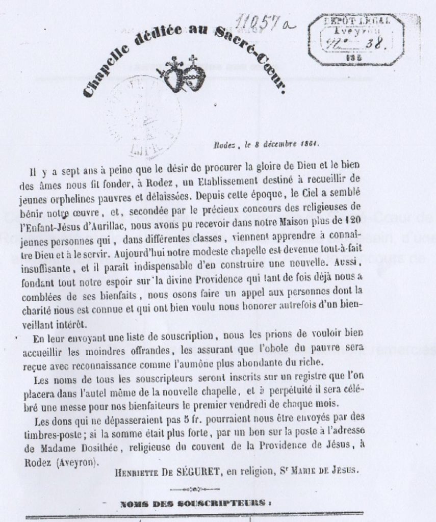 La semaine passée, la congrégation des soeurs de Jésus Serviteur a lancé un appel d’offre (SOLIDARITE PATRIMOINE – Vente de patrimoine) afin de vendre le premier sanctuaire aveyronnais dédié au Sacré-Coeur. La chapelle du Sacré-Coeur de la rue Béteille, financée à sa construction par les dons des fidèles ruthénois et aveyronnais sera vendue au plus offrant…