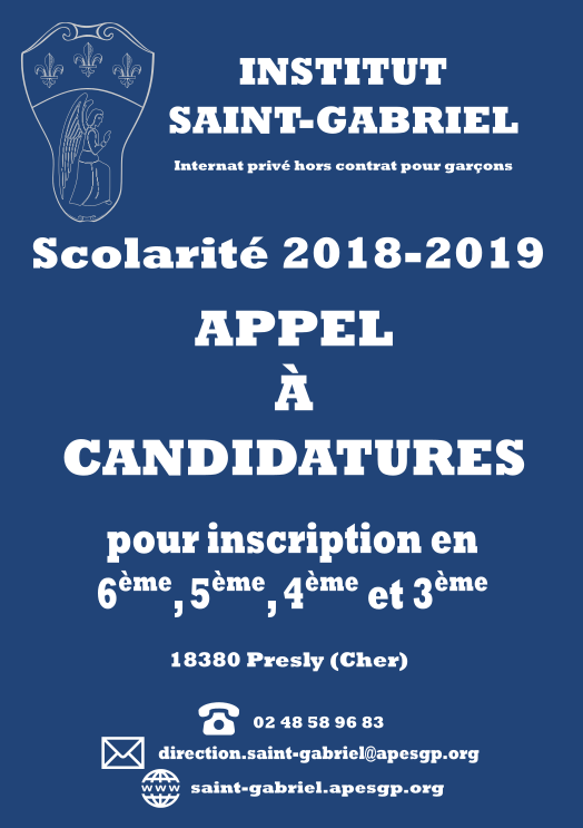 Accueil » Nos archives » Institut Saint-Gabriel à Presly Summorum Pontificum Institut Saint-Gabriel à Presly Un lecteur nous invite à diffuser largement les informations pour l’ouverture de l’Institut Saint-Garbiel à Presly (18) à la prochaine rentrée. En septembre 2018, l’Institut ouvre un Collège garçon (internat) de la 6è à la 3è. Institut Saint-Gabriel Article précédentLe mois béni du Ramadan... Article suivantProchaines retraites du Rosaire avec la Fraternité Saint-Vincent Ferrier 10 juin 2018