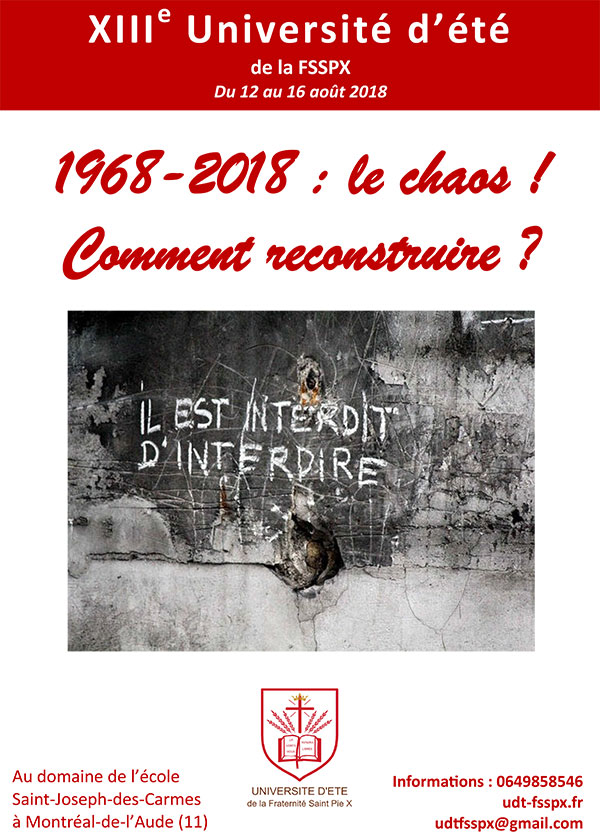 La Fraternité Saint-Pie X organise sa XIIIè université d’été du 12 au 16 août à l’école Saint Joseph des Carmes (Montréal de l’Aude). Elle a connu une belle participation ces dernières années preuve que tous ont besoin de se former.