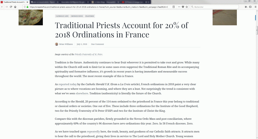 Le blog catholique traditionnel OnePeterFive s’intéresse aux ordinations en France et notamment à la proportion des ordinations dans la forme extraordinaire qui pour 2018 va représenter plus de 20% du total des ordinations en France. Ce chiffre étonne nos confrères américains.