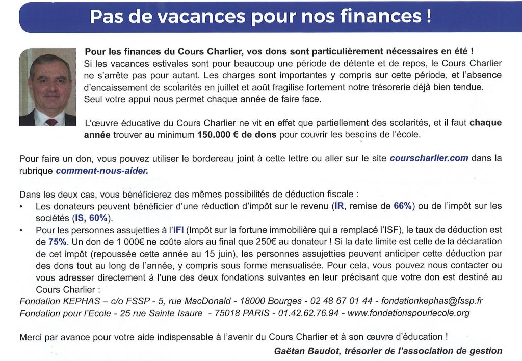C’est l’été !! les élèves sont en vacances… mais les écoles libres doivent encore payer des factures. Le Cours Charlier est un établissement scolaire indépendant fondé à Nantes par un groupe de parents dans les années 2000 pour les garçons. Il compte près de 200 élèves de la maternelle à la 3ème.