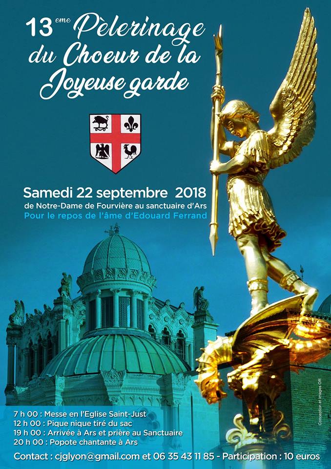 Accueil » Nos archives » Pèlerinage vers Ars le 22 septembre Summorum Pontificum Pèlerinage vers Ars le 22 septembre Le 22 septembre aura lieu le 13è Pèlerinage du Cheour de la Joyeuse Garde de Notre-Dame de Fourvière (Lyon) au Sanctuaire d’Ars. Article précédentBrève: Le Chapitre annuel de l'Institut du Christ Roi Souverain Prêtre Article suivantAbus sexuels : le silence des diocèses français 25 août 2018