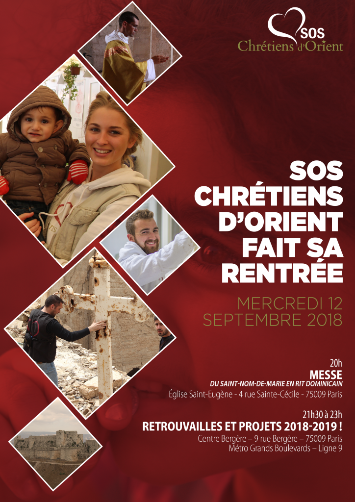Accueil » Nos archives » Messe d’action de grâce pour SOS Chrétiens d’Orient Summorum Pontificum Messe d’action de grâce pour SOS Chrétiens d’Orient SOS Chrétiens d’Orient fête ses 5 ans à l’occasion d’une messe célébrée le mercredi 12 septembre à 20h par le RP Augustin-M. Aubry en l’église Saint Eugène-Sainte Cécile à Paris. SOS Chrétiens d’Orient Article précédentPèlerinage à Loublande le dimanche 16 septembre Article suivant400 ans de l'ordination d'Alain de Solminihac 3 septembre 2018