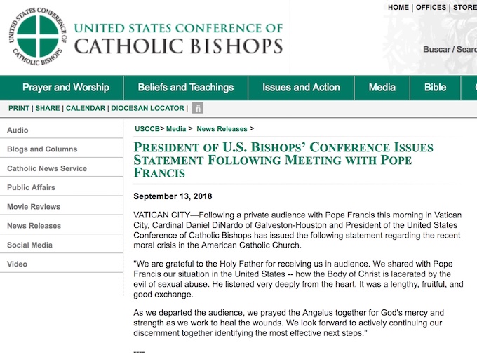 « Nous sommes reconnaissants au Saint Père de nous avoir reçus en audience. Nous avons fait part au pape de la situation qui est la nôtre aux États-Unis, et comment le Corps du Christ est lacéré par le mal des abus sexuels. Il a écouté très profondément avec le cœur. Ce fut un échange long, fructueux et bon.