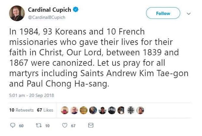 Mgr Blase Cupich, nommé archevêque de Chicago puis créé cardinal par le pape François a fait mémoire, dans un tweet du 20 septembre, du martyre des 93 Coréens et 10 Français sous la dynastie Joseon de Corée, et qui furent canonisés le 6 mai 1984 par saint Jean-Paul II. Le martyrologe romain a fixé en effet à ce jour la commémoration de « Saint André Kim Tae-gon, saint Paul Chong Ha-sang et [de] leurs compagnons martyrs (1839-1864) ». On félicitera donc le cardinal Cupich de le rappeler dans un tweet. Mais on s’étonnera qu’en cette occasion un prince de l’Église nous invite à… « prier pour tous ces martyrs »… On ne prie pas pour des martyrs, Éminence, mais on prie les martyrs de prier pour nous.
