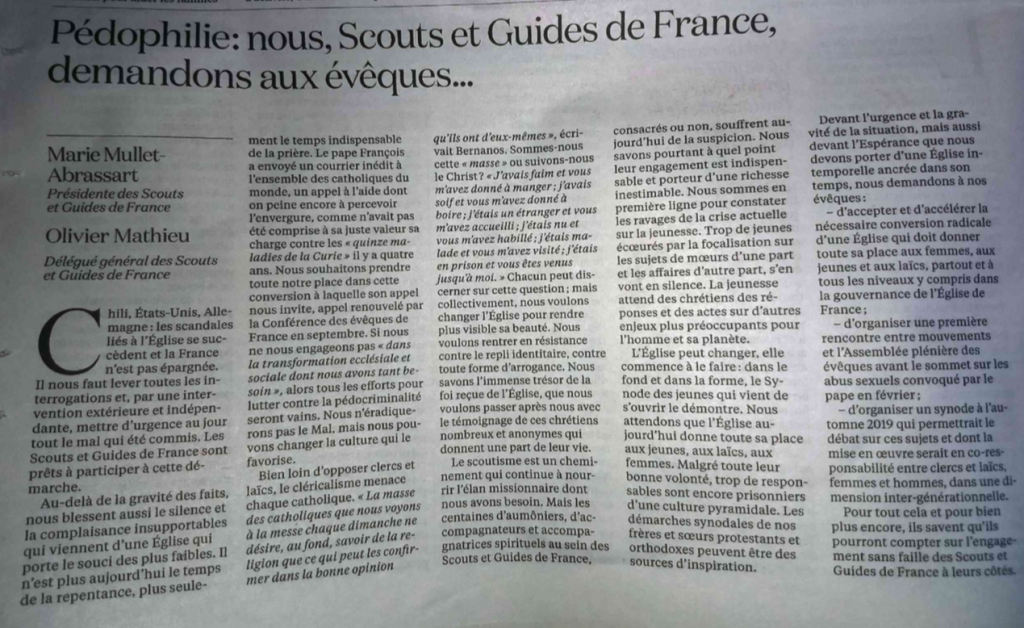 C’est dans La Croix. A la lecture de ce texte, il semble que l’argument de la pédophilie ne soit qu’un prétexte pour demander une réforme structurelle pour ne pas dire essentielle de l’Eglise, trop pyramidale… Comme si les Scouts de France se souciaient de la hiérarchie catholique… :