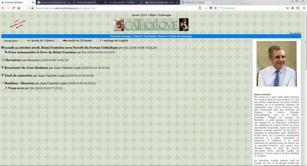 Dans le cadre des rendez-vous du Forum Catholique, Rémi Fontaine évoquera la personnalité et le parcours de Jean Madiran ce lundi. Il répondra aux questions des ‘liseurs’ de 18h30 à 22h. Il vient de publier aux Presses de la Délivrance « Itinéraires de Chrétienté avec Jean Madiran ». Cet ouvrage est préfacé par le Père Abbé du Barroux, Dom Louis-Marie. Yves Chiron en a signé la postface.
