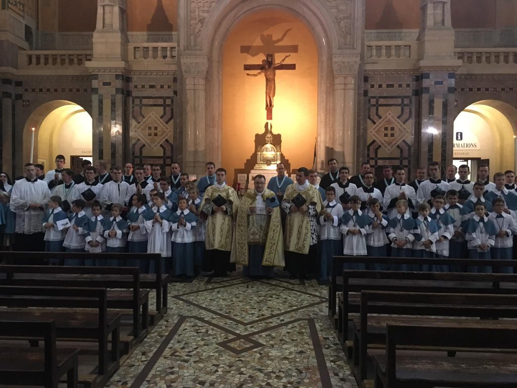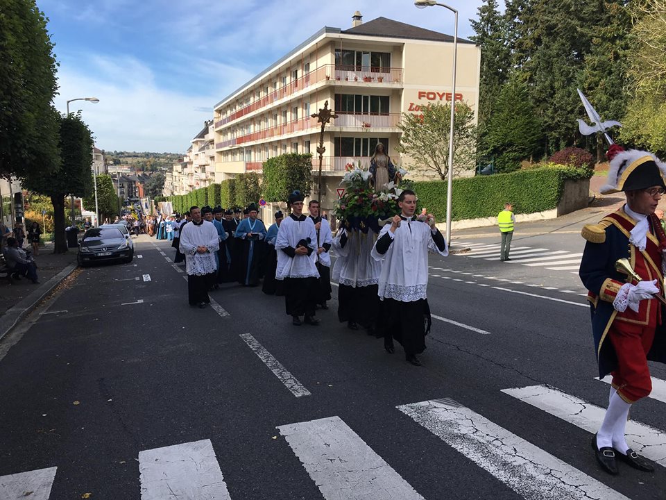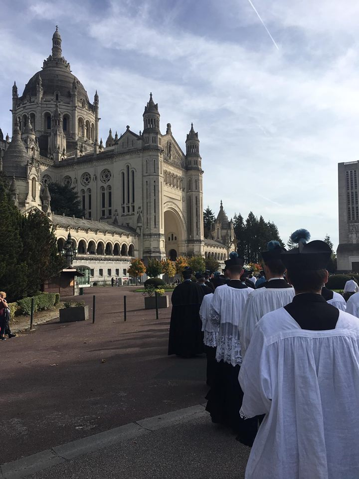 Ce samedi 13 octobre avait lieu le pèlerinage de l’Institut du Christ Roi pour les vocations à Lisieux. Après la messe solennelle célébrée par Mgr Wach à la cathédrale et un pique-nique familial, les fidèles se sont rendus en procession dans les rues de la ville jusqu’à la basilique pour le salut du Saint Sacrement.