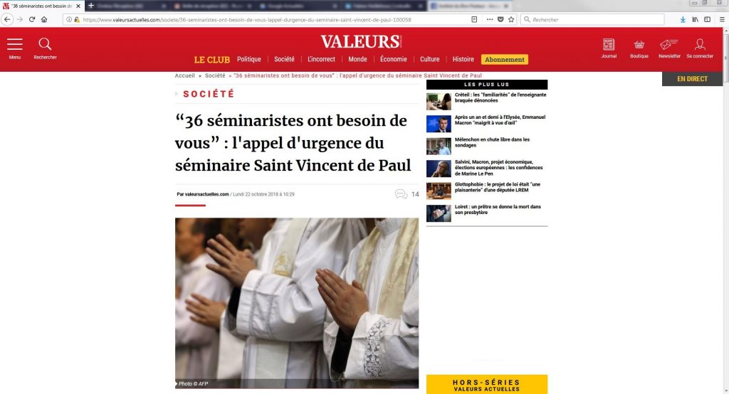 Accueil » Nos archives » Brève: Un appel à soutenir le séminaire de Courtalain Summorum Pontificum Brève: Un appel à soutenir le séminaire de Courtalain Valeurs Actuelles relaye l’appel de l’abbé Baumann, recteur du Séminaire Saint Vincent de Paul de Courtalain. Le séminaire de l’Institut du Bon Pasteur a besoin de soutiens financiers. Article de Valeurs Actuelles Séminaire Saint-Vincent de Paul Article précédentPèlerinage à Pontmain le dimanche 28 octobre 2018 Article suivantMgr Michel Aupetit visite la Fondation Jérôme Lejeune 23 octobre 2018