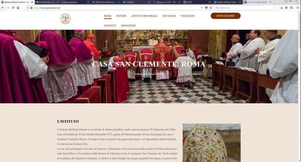 Un lecteur nous invite à diffuser le lien vers le site italien de l’Institut du Bon Pasteur. Il présente l’Institut ainsi que ses apostolats à Rome et à Naples. Les 2 prêtres résidents à Rome, les abbés Lenzy et Raffray, assurent également des cours au Séminaire Saint-Vincent de Paul de Courtalain (France) ainsi qu’à l’Université pontificale Saint-Thomas d’Aquin à Rome (pour l’abbé Raffray).