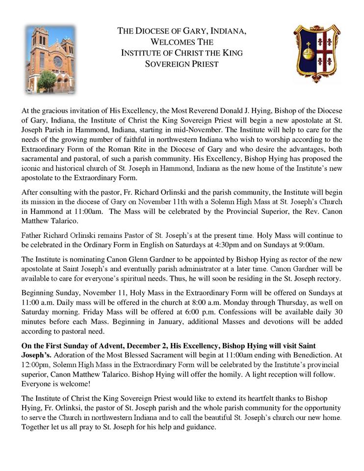 Après le diocèse Pittsburgh (USA), où l’Institut du Christ Roi a commencé début octobre un nouvel apostolat, Mgr Donald Hying, évêque de Gary (Indiana), a appelé l’Institut dans son diocèse pour un nouvel apostolat sur la paroisse Saint-Joseph de Hammond. Le chanoine Gardner sera en charge de la célébration de la messe dans la forme extraordinaire (le dimanche et en semaine) à partir du 11 novembre.