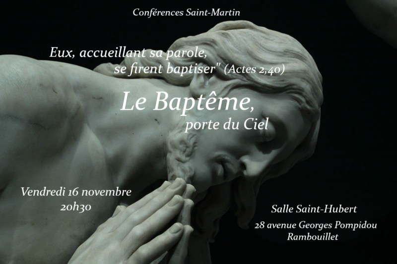 Accueil » Nos archives » Conférence ‘Le Baptême porte du ciel’ ce 16 novembre à Rambouillet Summorum Pontificum Conférence ‘Le Baptême porte du ciel’ ce 16 novembre à Rambouillet Un lecteur nous invite à diffuser les informations pour la prochaine conférence Saint-Martin donnée par l’abbé Damaggio, FSSP, ce vendredi 16 novembre à 20h30 à Rambouillet. FSSP Saint-Martin de Bréthencourt Article précédentMesse Pontificale à la Cathédrale Notre-Dame (Ottawa - Canada) vendredi 23 novembre Article suivantMgr d’Ornellas : Faire heureusement la vérité 16 novembre 2018