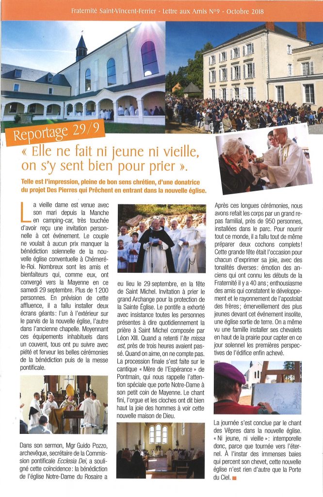 Nous avons reçu ces jours-ci la dernière lettre aux Amis (n°9, octobre 2018) de la Fraternité Saint Vincent Ferrier. Elle revient largement sur la bénédiction de l’église conventuelle du couvent Saint Thomas d’Aquin le 29 septembre dernier.