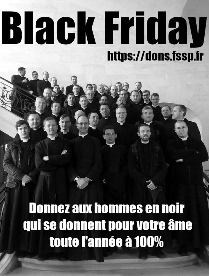 Jeudi dernier, les américains fêtaient le fameux Thanksgiving… Cette fête populaire est suivie par le « vendredi soir » (Black Friday), journée où les américains commencent leurs courses de Noël… et la frénésie des achats, des remises, des soldes commence ! Vendredi dernier, la Fraternité Saint-Pierre diffusait ce bon clin d’oeil sur sa page facebook… oui soutenons les hommes en noir !