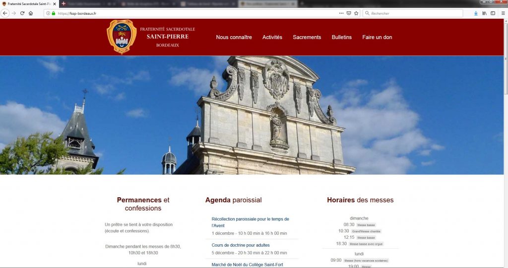 Accueil » Nos archives » Brève: Nouveau site pour la FSSP à Bordeaux Summorum Pontificum Brève: Nouveau site pour la FSSP à Bordeaux En cette nouvelle année liturgique, le site de la Fraternité Saint-Pierre à Bordeaux (église Saint-Bruno) a fait peau neuve. Vous y trouverez les informations sur toutes les activités de cette dynamique communauté bordelaise : Article précédentDépart des Carmélites de Montigné Article suivant« Le Club des hommes en noir » : L’Église a-t-elle inventé le Purgatoire ? 2 décembre 2018