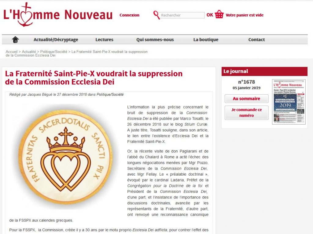 L’Homme Nouveau évoque sur son site internet la question de la possible suppression de la Commission Pontificale Ecclesia Dei, en charge de l’application du Motu Proprio Summorum Pontificum et des communautés sacerdotales et religieuses Ecclesia Dei :