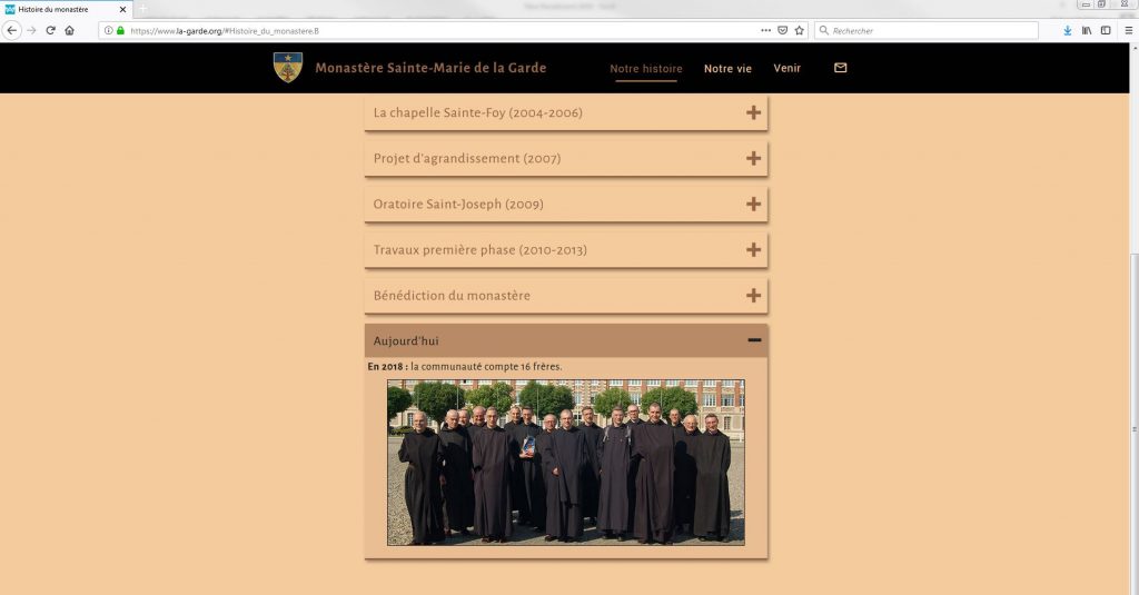 Un lecteur nous signale le nouveau site internet des moines bénédictins du Monastère Sainte Marie de La Garde. Vous y trouver un historique du monastère, ses lettres aux Amis et Bienfaiteurs et ce qui concerne le quotidien du monastère (horaire des offices, ateliers de sandales…). Fondé en 2002 par l’abbaye Sainte Madeleine du Barroux dans le Lot et Garonne, le monastère compte 18 frères.