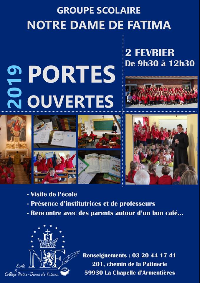 Un lecteur nous invite à diffuser cette invitation à la matinée porte ouverte de l’école Notre-Dame de Fatima ce 2 février à la Chapelle d’Armentières. Fondée en 1989, l’école est dirigée depuis 1998 par un prêtre de l’Institut du Christ Roi Souverain Prêtre, actuellement le chanoine de Dainville.