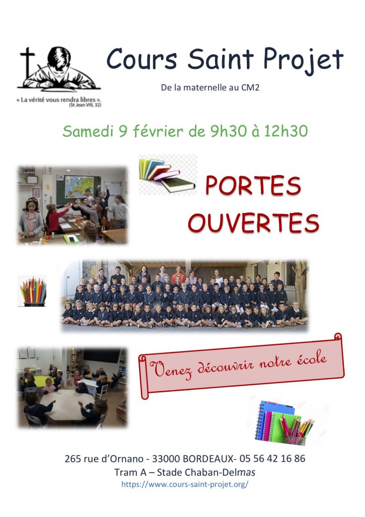 Fondée en 2005 par un groupe de parents, le Cours Saint-Projet à Bordeaux compte aujourd’hui une centaine d’enfants de la maternelle au CM2. L’aumônerie est assurée par une prêtre de l’Institut du Bon Pasteur (Paroisse Personnelle Saint-Eloi à Bordeaux). Le samedi 9 février de 9h30 à 12h30 aura lieu une journée portes ouvertes à l’école.