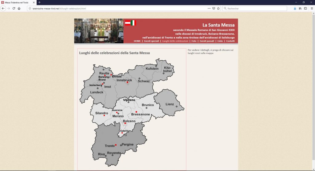 Un lecteur italien nous fait suivre l’adresse du site d’un groupe de fidèle dans le Tyrol italien. Cette province italienne est quasiment imbriquée dans l’Autriche voisine… et avec une forte communauté germanophone. Depuis quelques années, des prêtres de la Fraternité Saint-Pierre venaient du diocèse voisin (et du pays voisins) pour célébrer la messe dans la forme extraordinaire une fois par mois, puis deux fois par mois.
