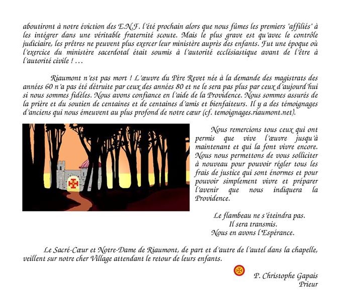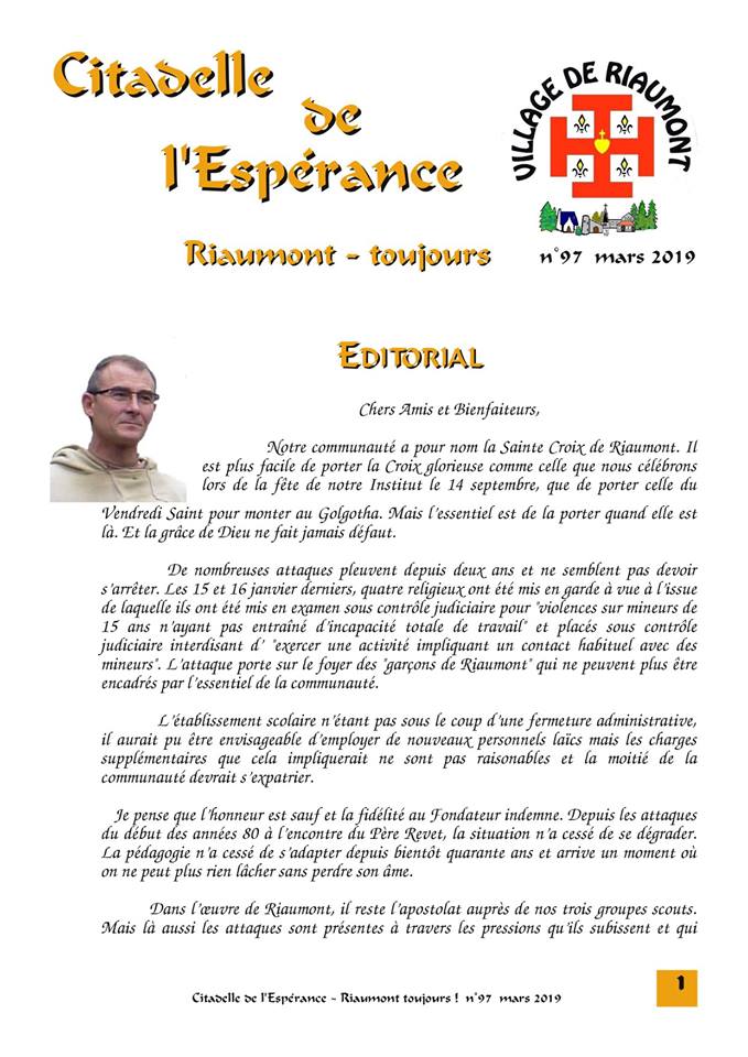 Nous publions l’éditorial de la lettre aux amis de Riaumont, Citadelle de l’Espérance (n°97), du Père Christophe Gapais, prieur de l’Institut de la Sainte-Croix de Riaumont qui revient sur l’affaire qui secoue le village de Riaumont depuis quelques semaines ayant entraîné des vacances forcées pour les enfants de l’école saint Jean Bosco :