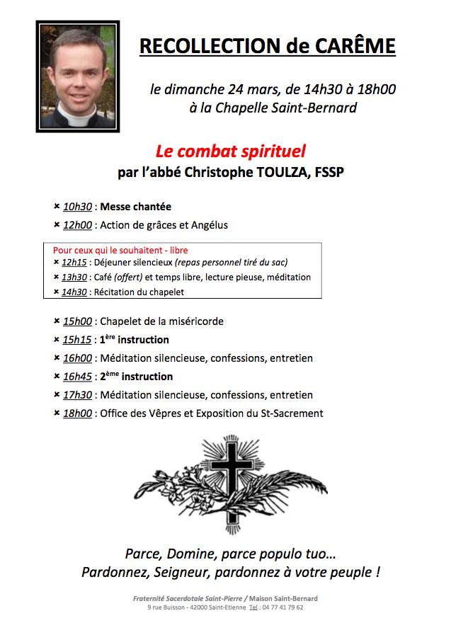 Accueil » Nos archives » Récollection de Carême à Saint-Etienne le 24 mars Summorum Pontificum Récollection de Carême à Saint-Etienne le 24 mars Une récollection de Carême sera prêchée ce dimanche 24 mars à la Chapelle Saint-Bernard à Saint-Etienne. FSSP Saint-Etienne Article précédentPortes ouvertes à l'Ecole Charles de Foucauld (Saint-Maur des Fossés) ce samedi 23 mars Article suivantUn évêque, un livre : Mgr Ravel 23 mars 2019