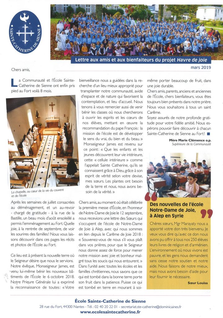 L’Institution Sainte Catherine est l’école de jeunes filles des Dominicaines du Saint-Esprit à Nantes. Fondés en 1977, l’école et le collège comptent aujourd’hui 230 élèves de la maternelle à la 3è. Les Mères avait dû également se résoudre à fermer le lycée, qu’elles espèrent bien ré-ouvrir prochainement. L’établissement a déménagé à l’été 2018 leur locaux étant trop petits. Sur la recommandation de Mgr James, évêque de Nantes, les Dominicaines ont acquis la propriété des Franciscaines Missionnaires de Marie situé rue du Fort à Nantes.
