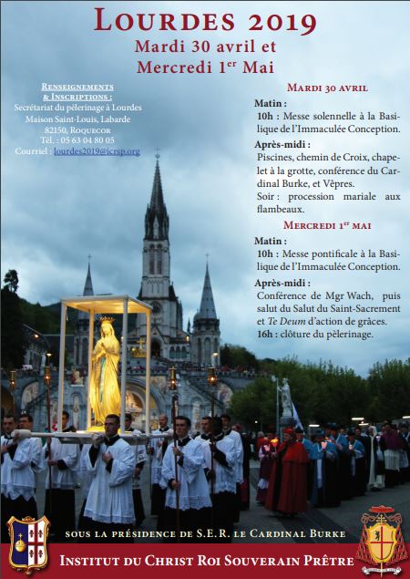 Un lecteur nous invite à diffuser à nouveau les informations pour le prochain Pèlerinage de l’Institut du Christ Roi Souverain Prêtre à Lourdes les 30 avril et 1er mai. Ce Pèlerinage sera présidé par le Cardinal Raymond Burke.