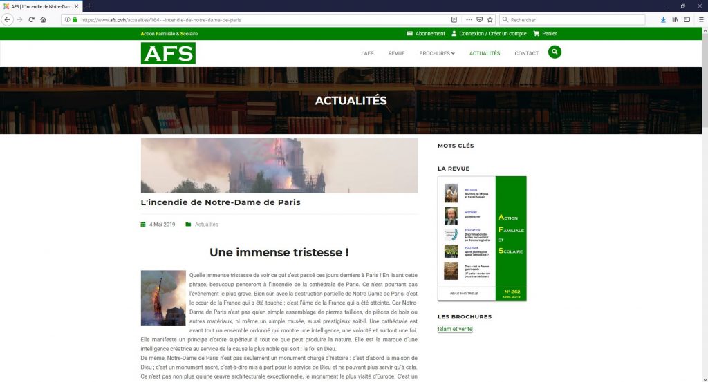 L’Action Familiale et Scolaire (AFS) dispose d’un nouveau site internet où vous retrouverez toutes les publications de l’AFS : sa revue, mais aussi toutes les brochures thématiques (Repères, l’Essentiel…). Le site dispose d’une boutique en ligne mais aussi d’une rubrique Actualité avec quelques contributions sur l’actualité du moment : www.afs.ovh