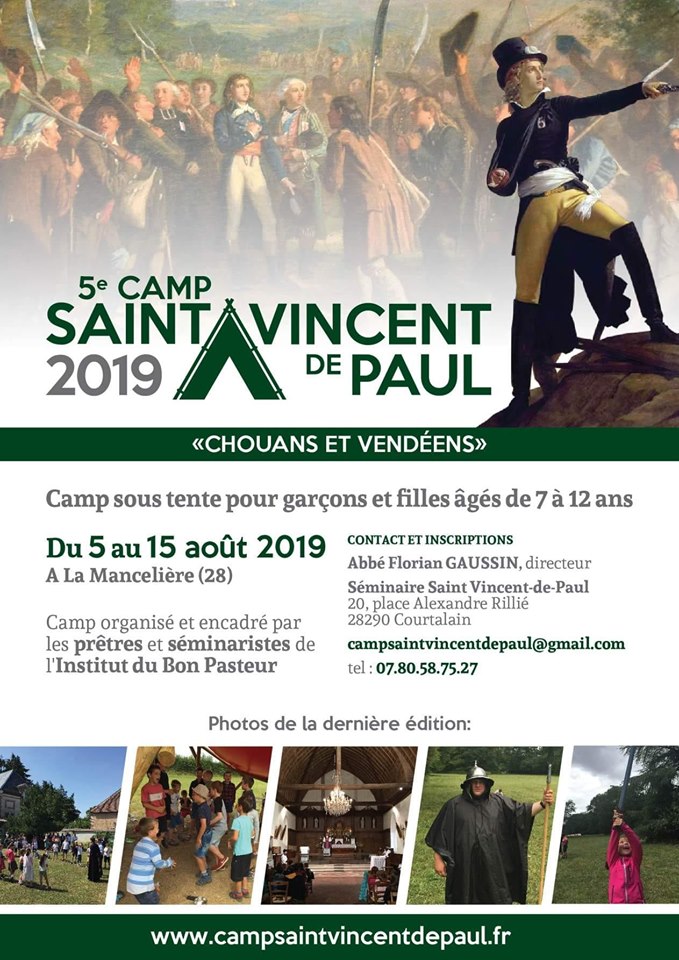 Accueil » Nos archives » Camp avec l’Institut du Bon Pasteur Summorum Pontificum Camp avec l’Institut du Bon Pasteur L’Institut du Bon Pasteur propose un camp pour jeunes enfants de 7 à 12 ans, le Camp Saint-Vincent de Paul, du 5 au 15 août encadré par des prêtres et séminaristes de l’Institut. Camp Saint Vincent de Paul (IBP) Article précédentOù rejoindre le Pèlerinage de chrétienté (de Paris à Chartres) ? Article suivantUn nouveau prêtre dans le diocèse de Saint-Brieuc 7 juin 2019
