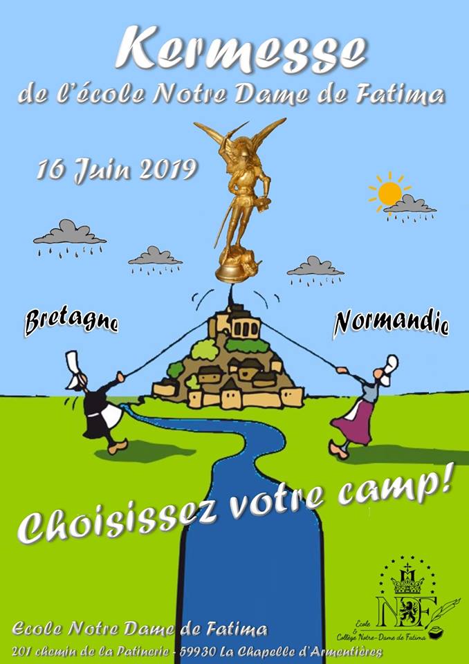 Un lecteur nous invite à diffuser l’annonce de la kermesse annuelle de l’Ecole Notre-Dame de Fatima (La Chapelle d’Armentières). Cette école fondée en 1989 est dirigée par un prêtre de l’Institut du Christ Roi. Elle compte environ 120 élèves (école et collège).