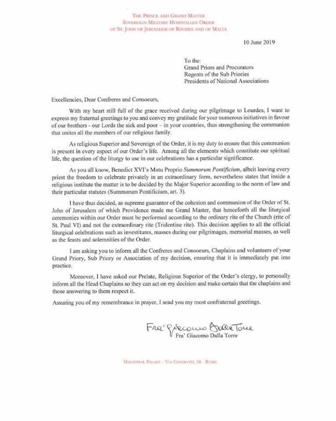 Texte de la lettre circulaire de Fra’ Giacommo Dalla Torre (traduction Riposte Catholique)