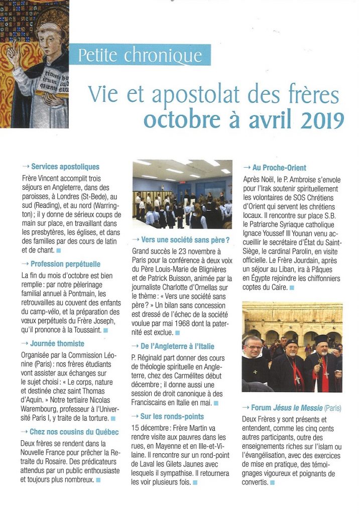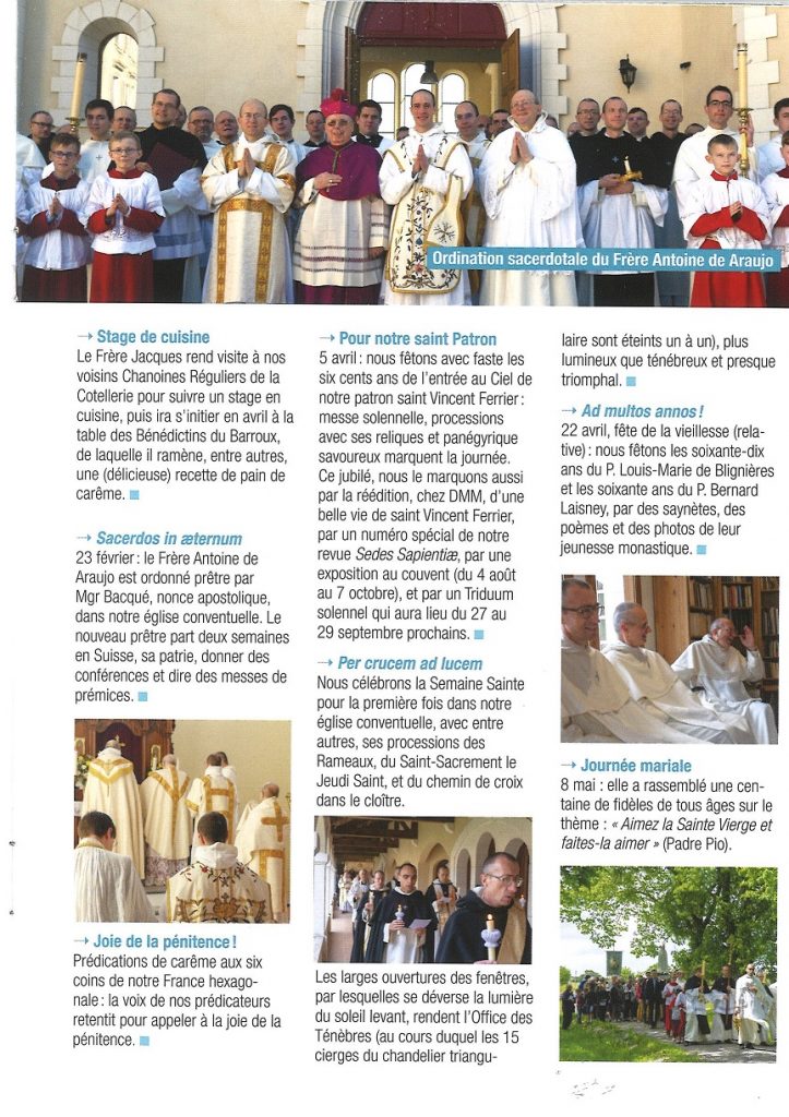 La Fraternité Saint Vincent Ferrier vient de publier sa dernière lettre aux Amis et bienfaiteurs. Vous y trouverez une belle homélie sur le sacerdoce du Père Agustin-Marie, une chronique des apostolats et évènements des derniers mois dont une mission avec SOS Chrétiens d’Orient pendant le Carême (extrait ci-dessous), quelques nouvelles du chantier de l’église conventuelle. Dans son éditorial, le Père Louis-Marie de Blignières évoque la figure de Saint Vincent Ferrier, saint patron de la Fraternité, qui un est « saint pour temps de crise ».