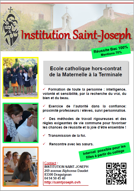 Un lecteur nous invite à diffuser ce présentation de l’Institution Saint Joseph à Draguignan, école fondée en 1985 et dirigée par les Dominicaines du Saint-Esprit. L’établissement compte aujourd’hui près de 280 élèves de la maternelle à la terminale.