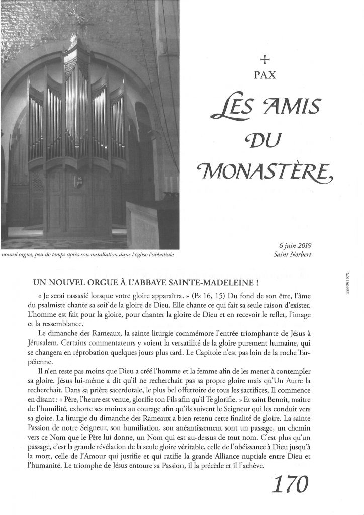 Si le chant grégorien donne à la prière de l’Église et des âmes une profondeur, une douceur et un charme inimitables, le chant de l’orgue le complète fraternellement en ajoutant sa note de gloire. La tradition de l’Église ne se trompe pas lorsqu’elle inspire à toutes les églises et à toutes les abbatiales de se doter d’un orgue. L’orgue est l’expression musicale du mont Thabor ; il est la mémoire du chant triomphant des Hébreux lors de l’entrée de Jésus à Jérusalem ; il est l’avant- goût de notre arrivée glorieuse dans le sein du Père et du chant éternel que toute la création, récapitulée dans le Christ, présentera au Père dans la lumière du Saint-Esprit. Et s’il existe des gloires vaines et trompeuses, celle que chante l’orgue est tout à fait convenable au mystère du Christ car, avec ses richesses musicales, l’orgue sait rester chaste, bien plus que la plupart des instruments.