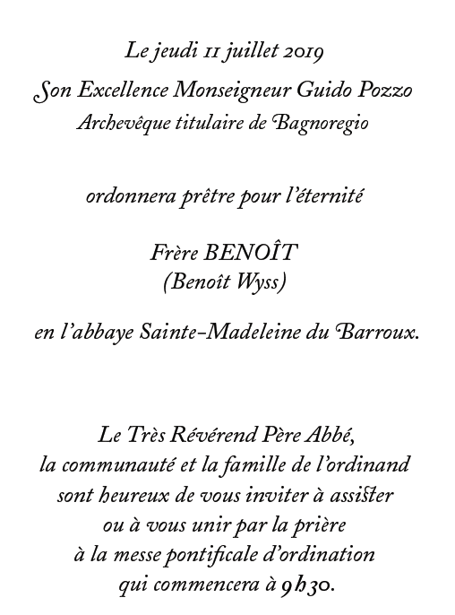 Accueil » Nos archives » Ordination sacerdotale au Barroux Summorum Pontificum Ordination sacerdotale au Barroux Nos lecteurs ont complété notre post sur les ordinations sacerdotales dans l’ancien rite. L’abbaye Sainte Madeleine du Barroux aura donc un nouveau prêtre le 11 juillet prochain. Abbaye du Barroux Article précédentUn nouveau prêtre pour le diocèse de Strasbourg Article suivantNotre-Dame de Chrétienté a relevé un calvaire 28 juin 2019