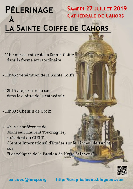 L’Institut du Christ Roi (Maison Notre-Dame de Rocamadour à Baladou) propose un pèlerinage à l’occasion de l’ostension de la Sainte-Coiffe à Cahors. A l’occasion du 900è anniversaire de la cathédrale Saint-Etienne de Cahors, la Sainte-Coiffe que portait Notre-Seigneur lorsqu’il a été enseveli peut être vénérée jusqu’à décembre 2019. Le Pèlerinage commence par une messe en forme extraordinaire à la Cathédrale à 11h00.