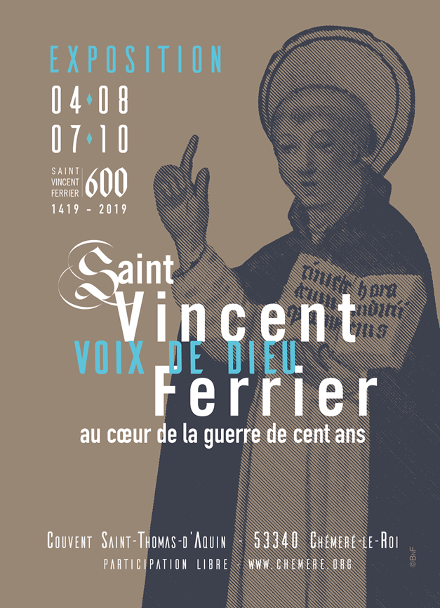 A l’occasion du 600è anniversaire de Saint Vincent Ferrier, la Fraternité Saint Vincent Ferrier propose une grande exposition « Saint Vincent Ferrier voix de Dieu au coeur de la guerre de cent ans » au Couvent Saint Thomas d’Aquin à Chémeré-le-Roi du 4 août au 7 octobre (lundi au samedi : 11h – 17h, dimanche : 14h – 16h ; participation libre).