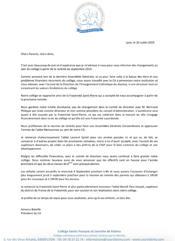 Un lecteur nous indique les prêtres de la Fraternité Saint-Pierre à Lyon reprennent l’aumônerie du Collège Saints François et Jacinthe de Fatima à Lyon.