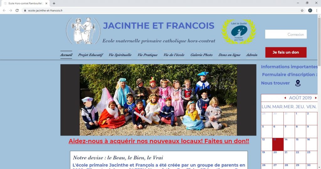 Fondée en 2001, l’école Jacinthe et François de Rambouillet a été fondé par un groupe de parents. Elle compte aujourd’hui 120 enfants… et l’école a reçu le Label Qualité de la Fondation pour l’Ecole en 2018. En lien avec la paroisse de Rambouillet, l’aumônerie est assurée par l’abbé Sébastien Damaggio, FSSP. L’école a un projet de développement notamment par l’acquisition et l’aménagement de nouveaux locaux plus adaptés avec le Collège Saint Jean Bosco, projet que nous vous invitons à soutenir.
