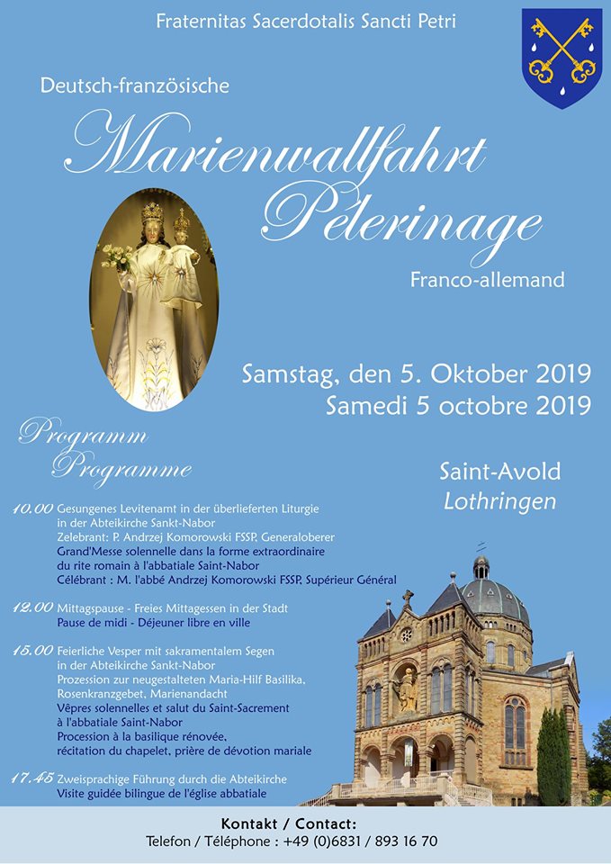 La chapelle Saint-Pierre-Canisius (District Allemagne de la Fraternité Sacerdotale Saint Pierre) organise un pélerinage franco-allemand à Notre-Dame-de-Bon-Secours à Saint-Avold (France) le samedi 5 octobre 2019.