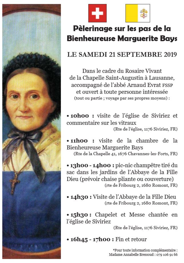Accueil » Nos archives » Pèlerinage à Siviriez (Suisse) sur les pas de la Bienheureuse Marguerite Bays Summorum Pontificum Pèlerinage à Siviriez (Suisse) sur les pas de la Bienheureuse Marguerite Bays Pèlerinage sur les pas de la Bienheureuse Marguerite Bays le samedi 21 septembreFSSP (Suisse) Article précédentLa timidité de Mgr de Moulins-Beaufort Article suivantMgr Marsset nouvel évêque auxiliaire de Paris 6 septembre 2019