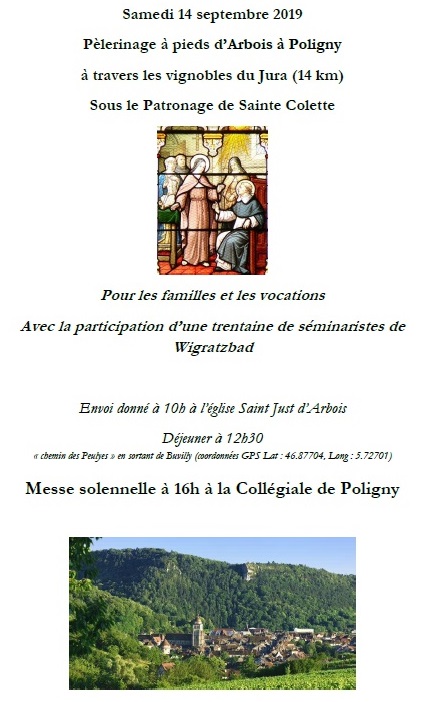 Un lecteur nous invite à rappeler le Pèlerinage de rentrée du Séminaire de la Fraternité Saint-Pierre (pour la section francophone) pour les familles et les vocations . Il se déroule cette année d’Arbois à Polignu dans les vignobles du Jura, sous le patronage de Sainte-Colette. Le pèlerinage est bien sûr ouvert à tous et facile d’accès pour les fidèles de Suisse, de Dôle, de Besançon, de Dijon, de Saône et Loire, de l’Ain ou encore de Lyon…