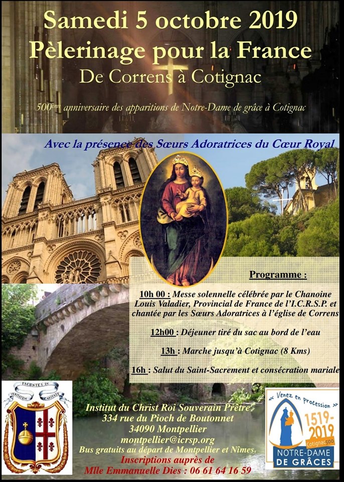 Accueil » Nos archives » Pèlerinage de l’Institut du Christ Roi à Cotignac Summorum Pontificum Pèlerinage de l’Institut du Christ Roi à Cotignac L’Institut du Christ Roi propose un Pèlerinage pour la France le 5 octobre de Correns à Cotignac. Départ des apostolat de l’Institut dans le sud de la France (Nîmes, Montpellier…). Institut du Christ Roi Article précédentPMA/GPA : Mgr Le Saux nous invite à manifester notre opinion Article suivantChangement d'horaire à La Vallée et La Rochelle 13 septembre 2019