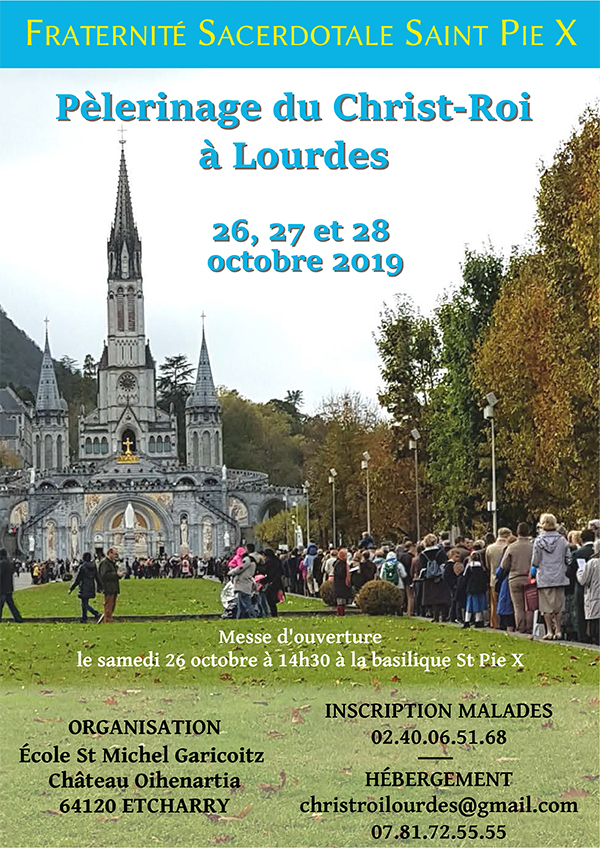 Comme chaque année, la Fraternité Saint-Pie X vous invite à participer au pèlerinage international du Christ-Roi à Lourdes les 26, 27 et 28 octobre 2019 en action de grâce pour la foi reçue et conservée en ces temps difficiles, pour supplier le Ciel de rester fidèle au combat de la Tradition, pour le règne du Christ-Roi, le triomphe du Coeur Immaculé, pour la Sainte Église Catholique Romaine.