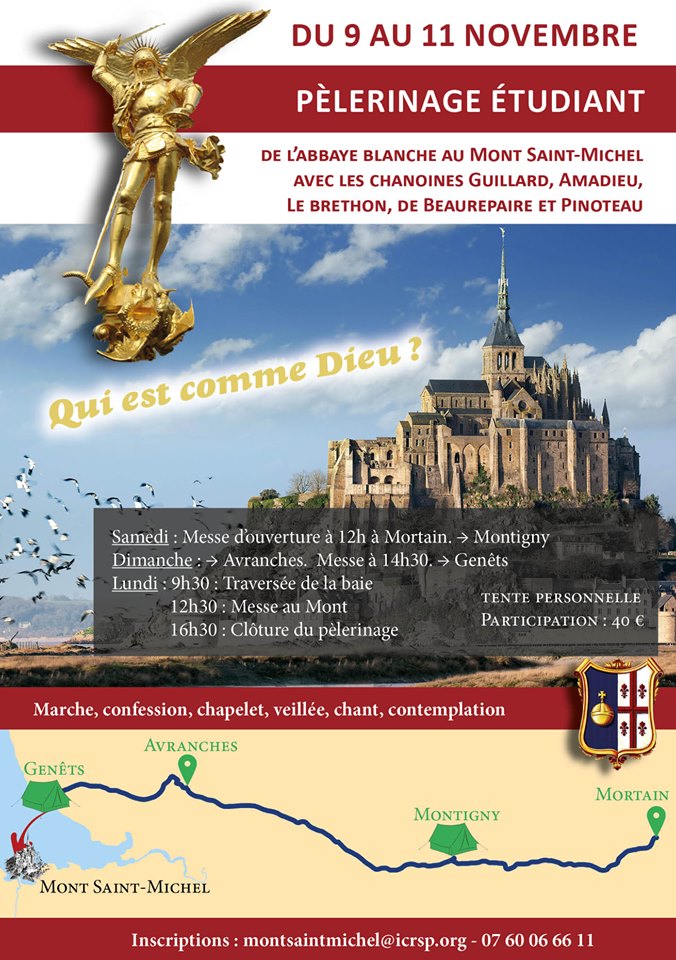 Accueil » Nos archives » Pèlerinage étudiants avec l’Institut du Christ Roi Non classifié(e) Pèlerinage étudiants avec l’Institut du Christ Roi L’Institut du Christ Roi propose un Pèlerinage pour étudiants au Mont Saint-Michel les 9, 10 et 11 novembre prochain. Article précédentScandale financier au Vatican : le jeu du cardinal Parolin Article suivantCardinal Zen : le Vatican a trahi les croyants chinois 5 octobre 2019