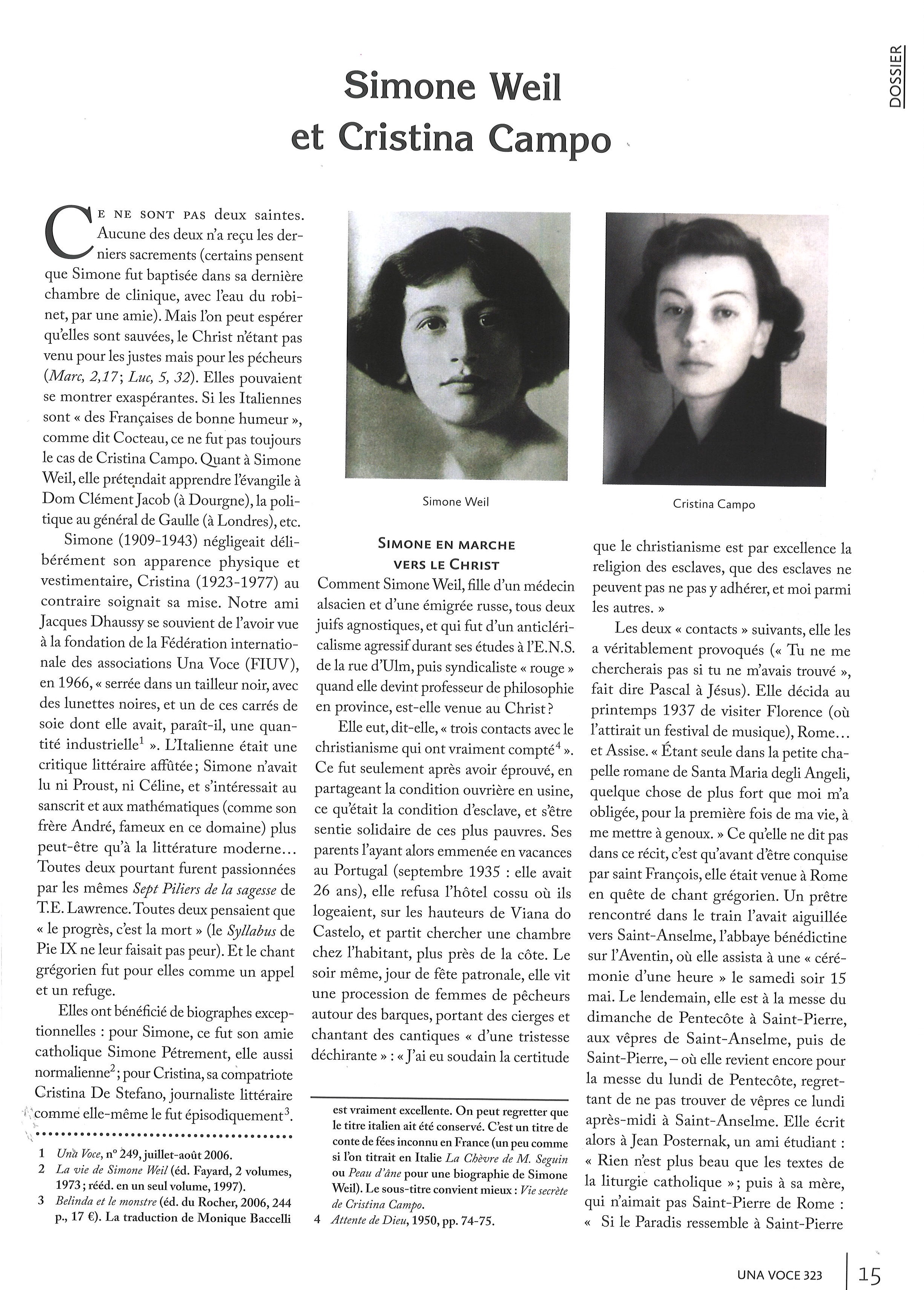 Le numéro 323 de Septembre – Octobre 2019 de la revue Una Voce vient de paraître. Il consacre un nouveau dossier aux Écrivains et la liturgie évoquant les figures deux écrivains Simone Weil (1909 – 1943) et de Christina Campo (1923 – 1977).