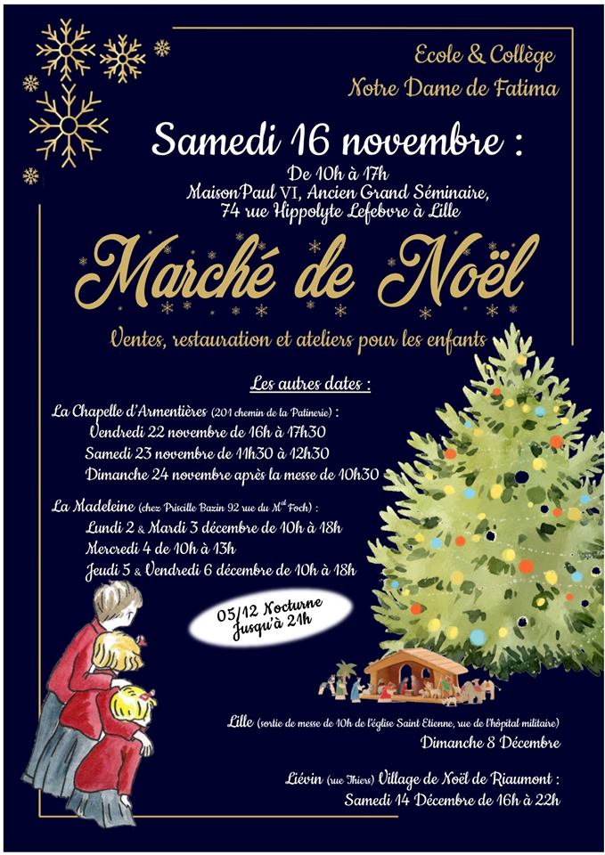 Le Marché de Noël de l’Ecole Notre-Dame de Fatima aura lieu, comme les années passées, sur les plusieurs semaines et en divers lieux autour de Lille à partir du 16 novembre… permettant à tous de venir faire quelques courses avant Noël (détail ci dessous).